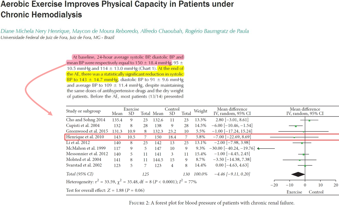 Como ejemplo, un artículo incluido en el metanálisis, Henrique (2010) fue una intervención no controlada (un solo grupo). Los meta-analistas utilizaron los números de presión arterial sistólica basal como la tensión del «grupo de control» y la final como la del grupo ejercicio dividieron el tamaño de la muestra (N = 14) por 2, diciendo que cada «grupo» tenía 7 participantes.