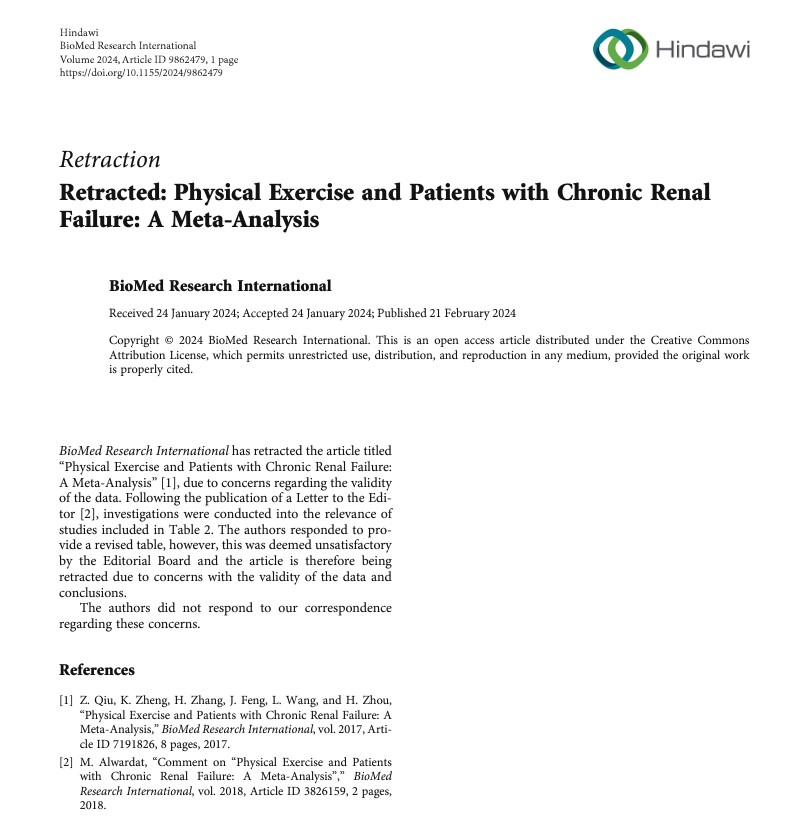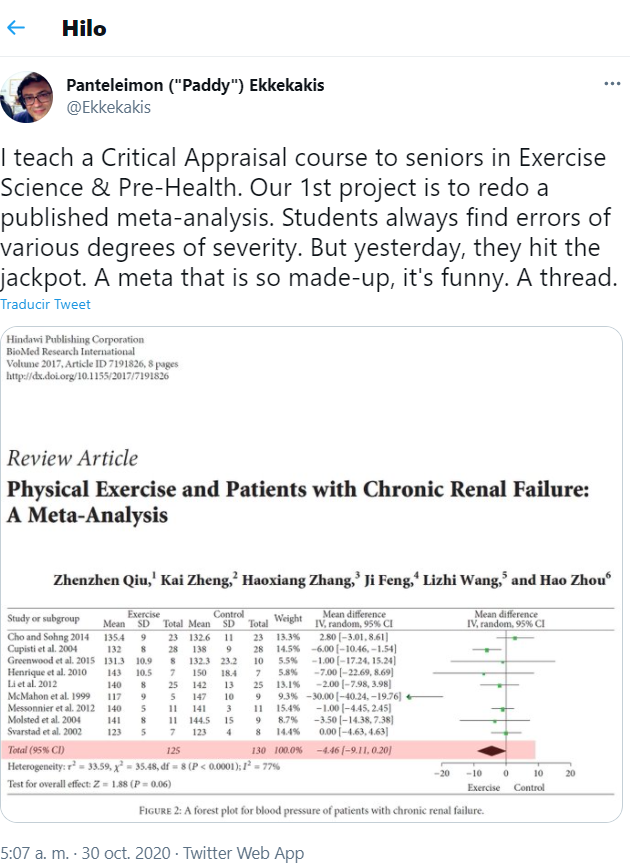 Como expone el propio P Ekkekakis en Twitter, (consultar hilo) uno de los elegidos fue un metanálisis de ensayos clínicos donde se comparaba ejercicio físico frente a control en enfermedad renal crónica. Se trataba de una revisión titulada Physical Exercise and Patients with Chronic Renal Failure: A Meta-Analysis publicado en Biomed Research International, revista anual presente en las principales bases de datos y con factor de impacto en 2019 de 2.276. La revisión evaluaba como intervencion programas diversos de ejercicio físico y como variables de resultado, los niveles de presión arterial y el nivel máximo de consumo de oxígeno en pacientes con insuficiencia renal en hemodiálisis.