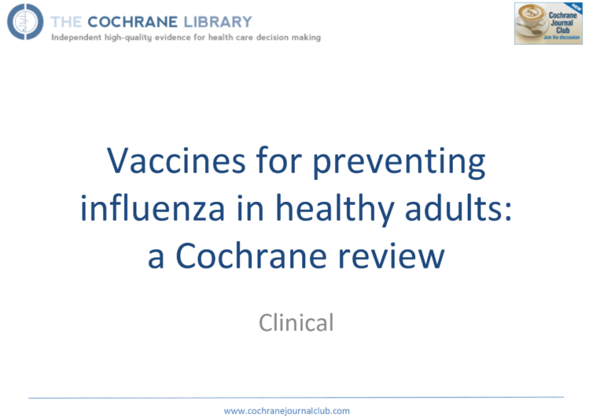 Conclusión: La vacuna contra la gripe tiene un efecto modesto en la reducción de los síntomas de la gripe y en la reducción de días de trabajo perdidos en adultos sanos. No hay evidencia de que afectan a las complicaciones de la gripe (como neumonía), o a la transmisión.