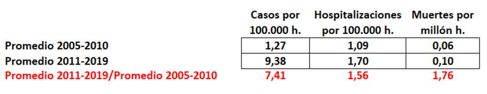 La dramática diferencia entre el tamaño aparente del efecto con el riesgo relativo (RR) y la diferencia de riesgo (DR) se debe a que RR es una medida relativa y DR es una medida absoluta teniendo en cuenta el riesgo basal de la gripe. Este riesgo inicial es relativamente bajo. Durante los meses de invierno será de siete (7) episodios de síndromes gripales cada cien (100) adultos, pero menos de uno de estos es causada por gripe.