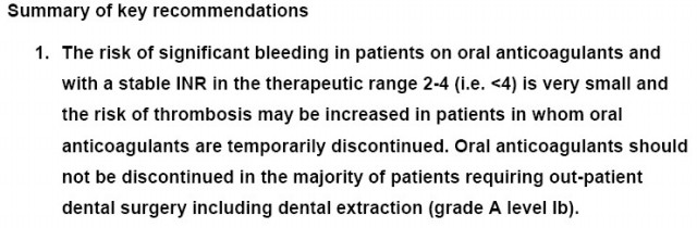 La segunda ha sido realizada por British Committee for Standards in Haematology (BCSH), esta dedicada a guiar el manejo de lo pacientes anticoagulados que van a ser sometidos a cirugía dental –Guidelines for the management of patients who are taking oral anticoagulants and who require dental surgery– y de la cual se puede leer un resumen en la revista Evidence Based dentistry. Al igual que en la anterior, son rotundos e indican que en la mayoría de los pacientes la anticoagulación no debe ser suspendida, ni siquiera modificada