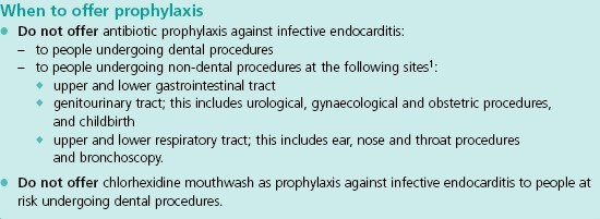 La primera Prophylaxis against infective endocarditis es del NICE, instituto británico comisionado para realizar guías de aplicación en el NHS, entre otras cosas señala la NO necesidad de emplear profilaxis antibiótica en pacientes con patología cardíaca estructural que presenten riego de sufrir endocarditis (estenosis o insuficiencia valvular, válvulas artificiales, miocardiopatía hipertrófica, enfermedades congénitas, etc.)