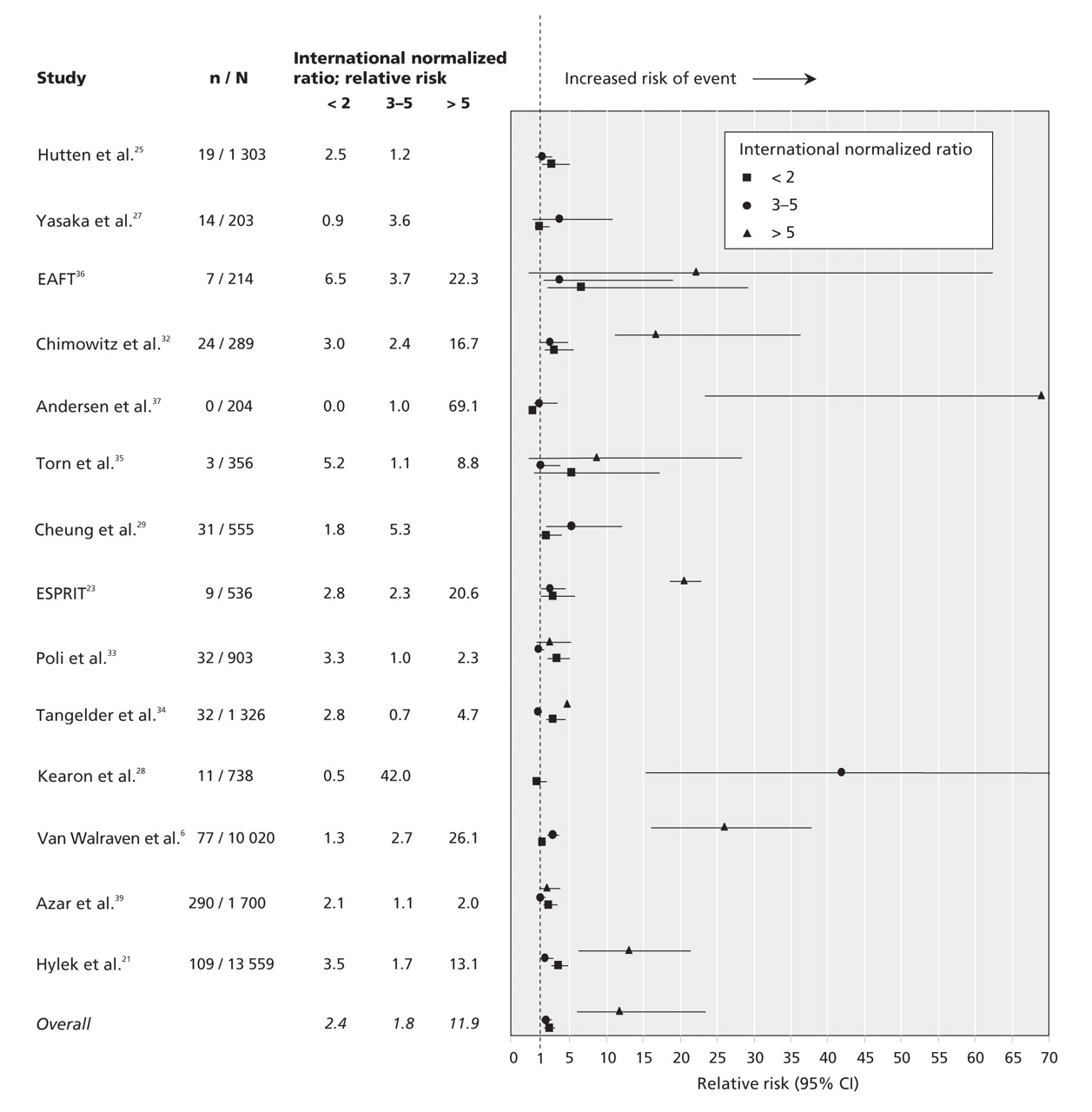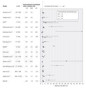 Estas cifras se revisan en un meta análisis Anticoagulation intensity and outcomes among patients prescribed oral anticoagulant therapy: a systematic review and meta-analysis publicado en el número de esta semana de la revista canadiense CMAJ . En el se muestra que como era de esperar el riesgo de hemorragia se incrementa significativamente cuanto mayor es el INR. Si se compara con el rango terapéutico aceptado en el INR, el riego relativo de hemorragia con un INR entre 3 y 5 es de 2.7 (IC 1.8-3.9;) y de 21.8 (12.1-39.4) cunado el INR sobrepasa el limite de 5. Es decir. Si el INR se sitúa por encima de tres pero por debajo de cinco es casi tres veces mas probable que se produzca una hemorragia que si se mantenía por debajo de tres, esta posibilidad se multiplica por veinte veces más cuando el INR supera el nivel de cinco. En el caso de eventos tromboembolicos el riego se incrementa significativamente cuando el INR cae por debajo de 2 y es menor entre tres y cinco. En términos de riesgo absoluto el nivel de INR que menor número de eventos tromboembolicos presentaba era el situado entre 2 y 3 .