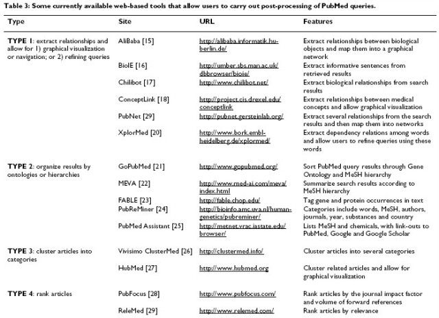 Esta aplicación web basada en los datos que ofrece PubMed permite en pocos minutos, y sin esfuerzo averiguar cosas como los autores más productivos en un determinado tema o revista, las revistas que publican más artículos sobre un tema determinado, las palabras claves más frecuentes en los artículos que publica una revista , etc. Destaca la tabla del final del artículo donde se reseñan otras aplicaciones que permiten llevar a cabo procesamientos originales de los datos de PubMed.