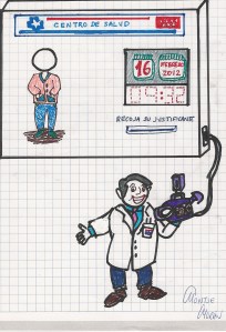 - Panel mural o Head Through donde se ha dibujado la figura de un/una paciente estándar con el hueco correspondiente a la cara vacío El usuario solo tiene que situarse detrás y poner en el hueco su jeta procurando expresar el grado de gravedad que le aqueja (se les proporcionara un libro de expresiones faciales para mostrar gravedad leve, moderada e importante).