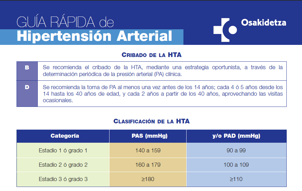 pertensión Arterial publicada por Osakidetza recientemente que responde a 32 preguntas de una guía anterior (sobre HTA) y a otras ocho nuevas cuestiones sobre la atención al paciente hipertenso como son: el tratamiento de las urgencias hipertensivas extrahospitalarias, la elección del tratamiento farmacológico en el anciano o nuevas indicaciones para la AMPA y MAPA.