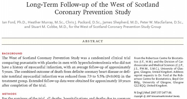 Un clásico el West of Scotland Coronary Prevention Study se prolongo, sin ser ya ensayo clínico, diez años mas y se publican los resultados ahora doce años más tarde, de nuevo en en el New England, los pacientes inicialmente asignados al grupo tratamiento seguían muriéndose menos y teniendo menos eventos cardiovasculares. A sacar conclusiones…. venga