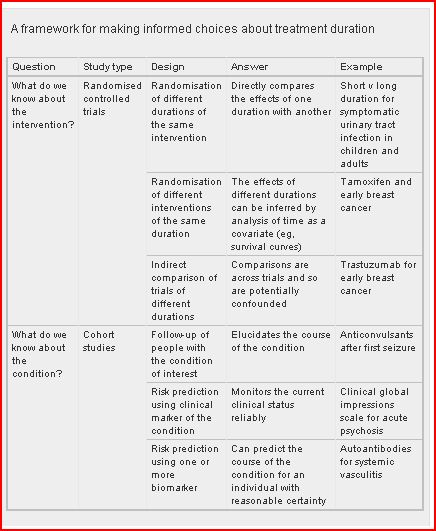 Para tomar decisiones informadas sobre la duración, los ensayos clínicos donde se “ensaye” directamente la duración de la intervención, proporcionan la mejor evidencia. Pero este tipo de ensayos no son muy habituales con lo que los autores hacen una propuesta sobre el tipo de estudios que podemos utilizar para responder a las interrogantes sobre duración en ausencia de tales ensayos (ver tabla)