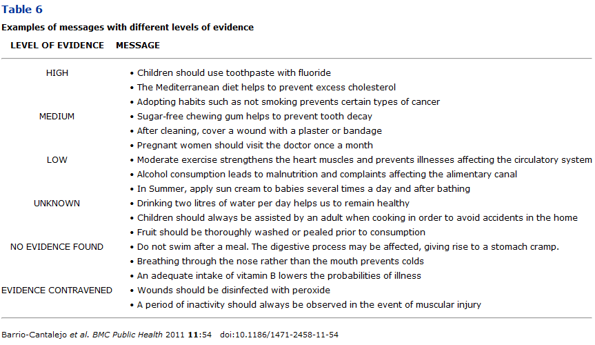 Los resultados mostraron que menos del 15% de los mensajes estaban basados en algún grado de evidencia conocido (alta, media o baja). Un 61% de los mensajes de salud analizados estaban basados en alguna evidencia científica, pero sin poderse especificar el grado de la misma y en un 24,6% de los mensajes analizados no existía evidencia científica que apoyara su contenido. Por temas específicos, un 41,7% de los mensajes sobre accidentes en el hogar, un 40,6% de los referidos a conducta sexual y SIDA y un 28,6% de los referidos a consumo de alcohol no estaban basados en evidencia alguna.