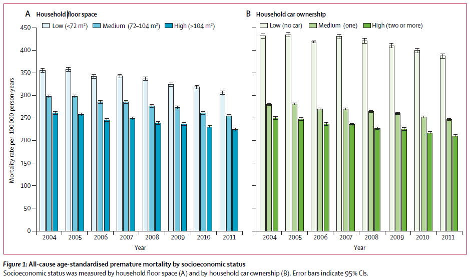 Por su actualidad y contraintuitivas conclusiones destacamos un artículo publicado en Lancet a finales del año pasado donde se muestra que en España la mortalidad lejos de aumentar durante la crisis, disminuyo especialmente en las clases socioeconómicas más bajas. Basado en el censo con más de 36 millones de inscritos y clasificando a estos en tres grupos socioeconómicos (bajo, medio y alto) según riqueza material, se examino la mortalidad durante el período 2004-2007 o precrisis y 2008-2011 coincidente con la gran crisis económica reciente. En los dos periodos la mortalidad descendió, pero los datos revelan que la mortalidad tuvo una disminución más marcada durante la crisis que en el periodo anterior. La aceleración de la tendencia descendente de la mortalidad se dio en todos los niveles de riqueza, pero fue más acusado en los niveles más bajos, y se produjo para la mayor parte de las causas de muerte.