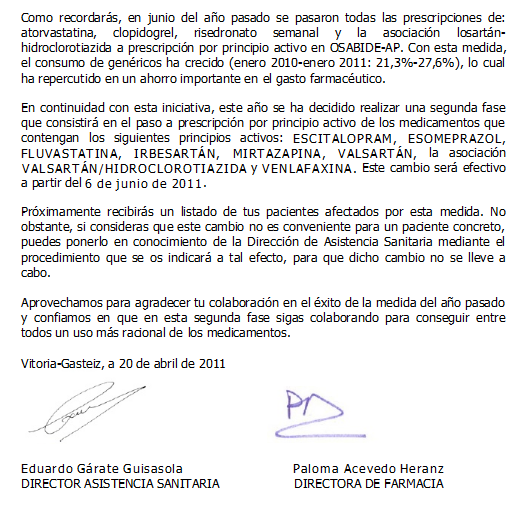 Como la burra al trigo, los GAL (Gestores Ahorradores y Listillos) vuelven, y vuelven a hacer de las suyas. El comando Osakidetza vuelve a poner en marcha un sistema informático que modifica automáticamente la prescripción de fármacos por sus equivalentes genéricos. Efectivamente ya lo habían avisado hace un año cuando comenzaron «El sistema se extenderá progresivamente a otros medicamentos» .