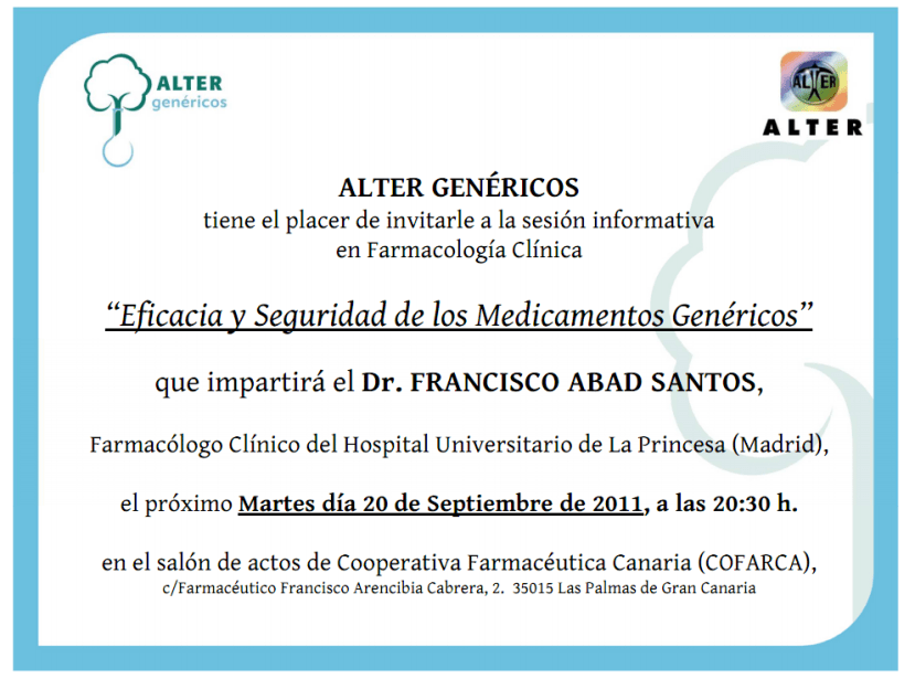 Al finalizar la sesión informativa se servirá un cocktail por gentileza de los Laboratorios ALTER S.A. Si deseas puedes inscribirte a través del correo electrónico o llamando la telefono…
