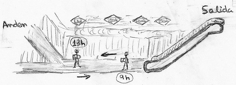 El suceso ocurrió a la ida y a la vuelta de la reunión, en la estación de Begoña del metro de Madrid ( salida a hospital de La Paz y las cuatro torres). Se resume en el gráfico adjunto, que explico por mi escasa habilidad con el dibujo: el protagonista – muñequillo- era un músico que tocaba el acordeón en las galerías del metro para sacarse unas monedas.