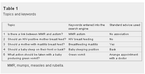 Cuando los médicos hemos llegado a la evidente conclusión de que digamos lo que digamos, los pacientes recurren a Internet para obtener información médica sobre los procesos que padecen, la siguiente apuesta es determinar la exactitud de la información que está en la red. Para comprobarlo, pediatras del Reino Unido en un artículo titulado Googling children’s health: reliability of medical advice on the internet utilizan búsqueda en Google – estos si siguen al menos el patrón de búsqueda de la mayoría de los pacientes- con cinco términos que define temas frecuentes en pediatría (vacuna del sarampión-paperas-rubéola y autismo, la infección por el VIH y lactancia, mastitis y lactancia y posición de los bebes para dormir y Vómitos biliosos de los lactantes.) -ver tabla1: