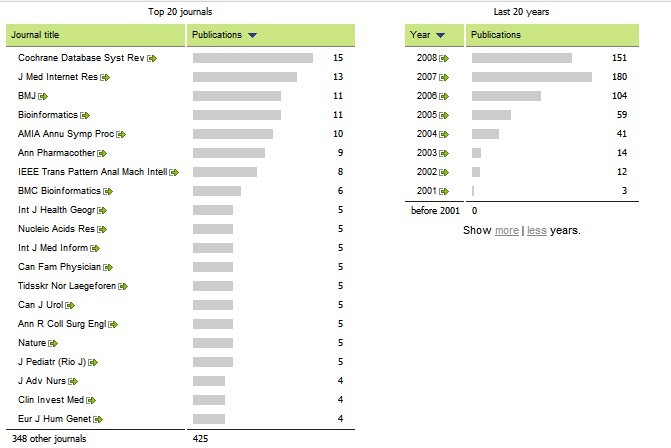 Una búsqueda en pubmed -¿rivales?- nos da más de quinientos artículos en los que aparece el termino google (el primero es del 2001, la distribución por años y revistas que los publican se puede ver en la figura)