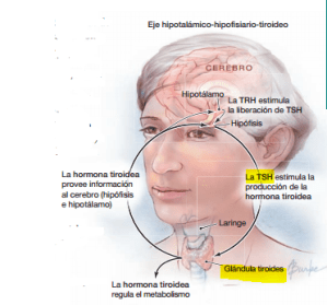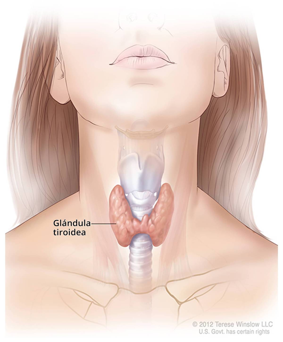 La glándula tiroides, una glándula con forma de mariposa, de unos 5 centímetros de largo, ubicada justo debajo de la laringe, produce hormonas responsables del metabolismo (cómo el cuerpo usa la energía). La glándula hipófisis, ubicada en la base del cerebro, secreta la hormona estimulante de la tiroides (thyroid-stimulating hormone, o TSH), que hace que la tiroides produzca y libere tiroxina, la principal hormona tiroidea.