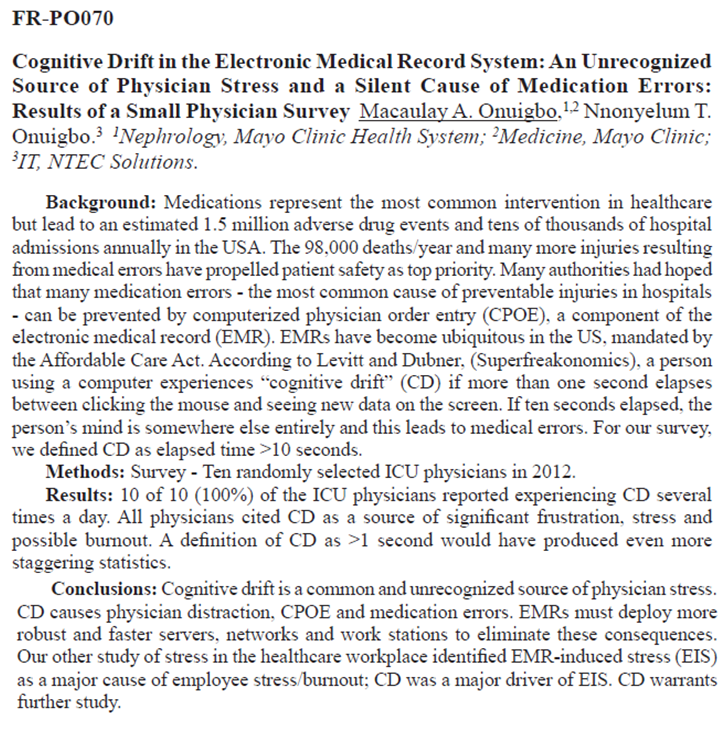 El Dr Onuigbo cita como fuente del concepto de deriva cgnitiva a Steven D. Levitt y Stephen J. Dubner, autores de Superfreakonomics, un bet seller sobre economía y su importancia en la vida cotidiana. En este libro se habla entre otras muchas cosas, de cómo dos médicos de urgencias en Washington afrontaron los problemas de su servicio. En concreto se dieron cuenta que lo que necesitaban los profesionales de urgencias era información. Solo un nuevo sistema informático solucionaría sus problemas, pero un sistema ideal que fuera: