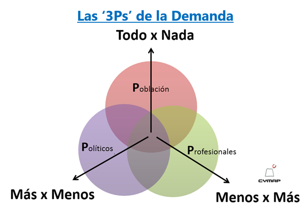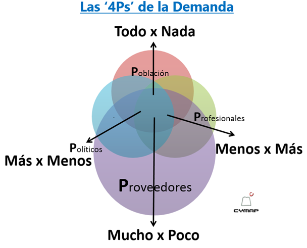 La cuestión se vuelve a complicar cuando comienza a reconocerse que en la génesis de la Demanda, ni los profesionales, ni los políticos, ni los pacientes, hoy son los principales actores. (ver más en Innovación para la sostenibilidad del sistema).