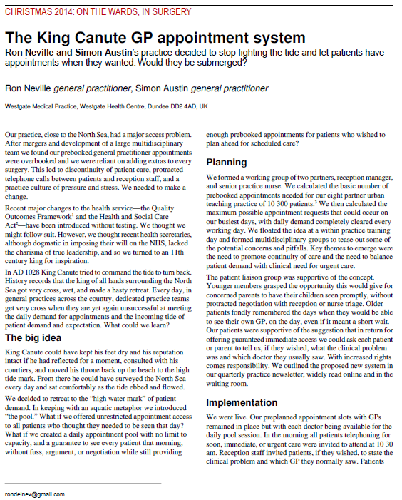 Nuestros colegas ingleses Ron Neville y Simon Austin tratan el tema (The King Canute GP appointment system BMJ 2014;349:g7228) apoyados en la lección que aprendió o que enseño, según versiones de la historia, Canuto el Grande, nacido el año 995. El Rey Canuto II de Dinamarca, también logró ser Rey de Inglaterra en el siglo XI, como consecuencia de las invasiones vikingas por los mares del norte. Al parecer nuestro rey, tan poderoso era, quiso retar a los mares, en la versión del artículo, sentado a la orilla del océano y ordenando al mismo que detuviera el avance de la marea. La historia acabó en un buen remojón.