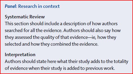 Por tanto los artículos remitidos para publicación a The Lancet a a partir de agosto deben incluir una revisión sistemática de la investigación previa en la sección de discusión e incluir en esta misma sección una confrontación de su resultados con las de los estudios localizados mediante la revisión como se puede ver en la tabla