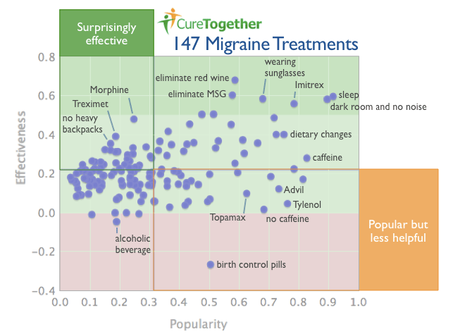 Sobre todo curioso cuando no concuerda con nuestro conocimiento previo. Se puede ver la posición que ocupan fármacos tan aparentemente eficaces como el sumatriptan ( Imitrex) o el ibuprofeno (advil) y determinadas medidas no farmacológicas