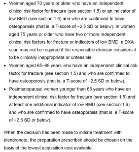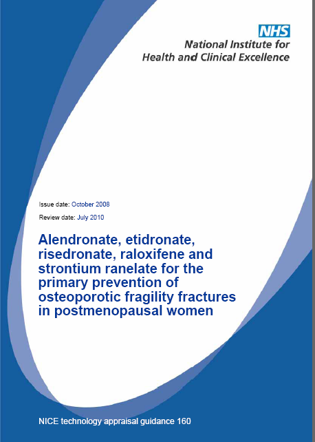 Pues bien, cercano a este día, apenas hace dos, el instituto británico de simpático nombre NICE (National Institute for Health and Clinical Excellence) acaba de publicar la versión definitiva y dirigida a profesionales sobre la utilización de los bifosofonatos el estroncio y el raloxifeno en la prevención primaria y secundaria de mujeres con osteoporosis posmenopáusica. Como datos de interés en prevención primaria hacer notar que se prioriza el uso del alendronato, dejando los otros bifosfonatos para cuando hay intolerancia al anterior, que no se recomienda el raloxifeno, y que los factores de riesgo de fractura (independent clinical risk factors ) se reducen a antecedentes familiares directos de fractura de cadera, consumo excesivo de alcohol ( > 4 unidades/día) y artritis reumatoide. También refieren unos «indicadores de baja densidad ósea como IMC bajo, enfermedades como espondilitis anquilopoyética, enfermedad de Chron, o la misma artritis reumatoide, inmovilidad prolongada y menopausia precoz no tratada.