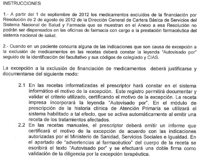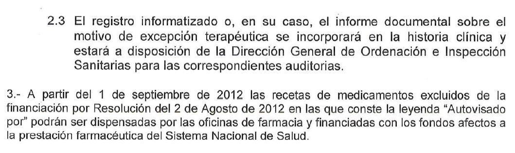 La Resolución de 2 de agosto de 2012, por la que se procede a la actualización de la lista de medicamentos que quedan excluidos de la prestación farmacéutica en el SNS contemplaba la exclusión de la financiación de 417 medicamentos a partir del 1 de septiembre, pero a la vez establecía una excepción para 97 de ellos (punto 3 del Anexo de la Resolución) que permanecen financiados con cargo al SNS exclusivamente para las indicaciones que se establecen en cada caso.