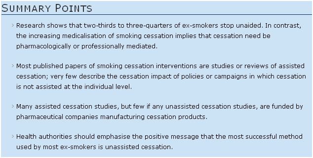 - Las autoridades sanitarias deberían insistir en el mensaje positivo de que el método de mayor éxito, utilizado por la mayoría de los ex-fumadores es dejar de fumar simplemente , sin necesidad de asistencia o ayuda.