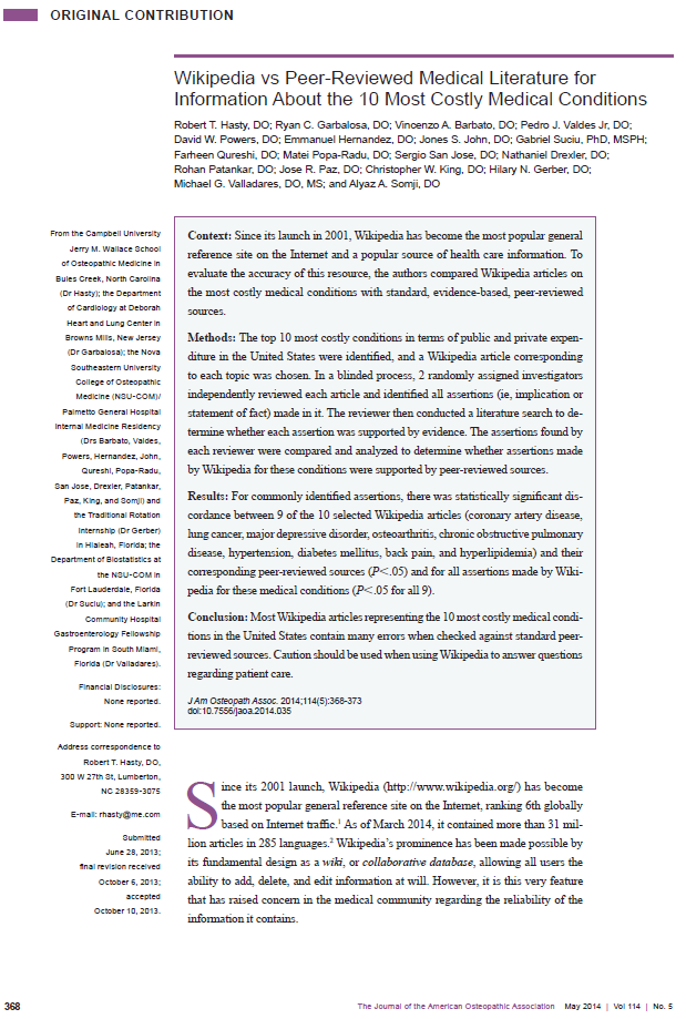 Ese era el titular de un periódico nacional al reseñar un artículo publicado en The Journal of the American Osteopathic Association, con el titulo Wikipedia vs Peer-Reviewed Medical Literature for Information About the 10 Most Costly Medical Conditions.